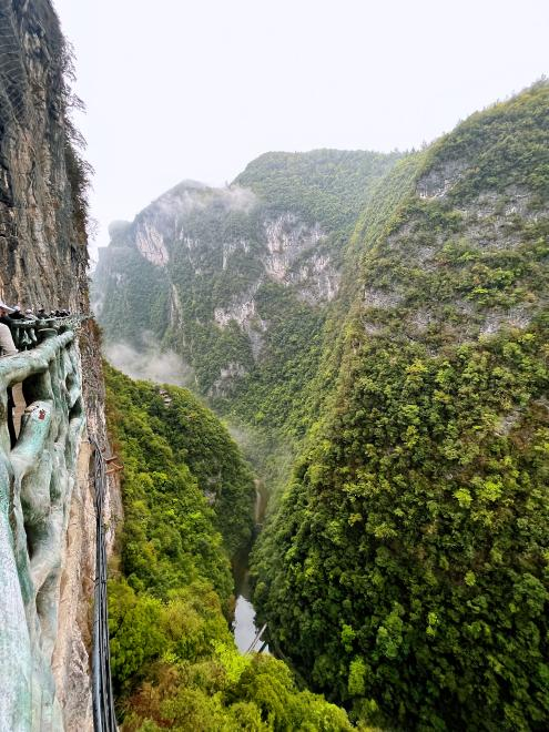 活動(dòng)當(dāng)天,大家乘車約三個(gè)小抵達(dá)屏山大峽谷風(fēng)景區(qū)。步入景區(qū),大家按分組開始了登梯爬高、上下行進(jìn)的尋美行程。進(jìn)入檢票長(zhǎng)廊后各個(gè)小組從墨嘎寨入口開啟行程,順著巖壁棧道從上而下相繼經(jīng)過(guò)罡步天梯、步云臺(tái)、阿打鋪?zhàn)蛹⒅行?、千尋瀑、浣云橋、蘭索橋等景點(diǎn)后來(lái)到桃花渡碼頭乘游船泛舟觀賞一線天、五尺門等景點(diǎn)后登岸,后繼續(xù)順著山道攀爬至岔溪口觀景臺(tái)、儺愿洞、逍亭,最終到達(dá)杜宇樓結(jié)束全程。一路下來(lái)上千級(jí)的山道臺(tái),所有職工毅力堅(jiān)定,積極克服天氣影響,挑戰(zhàn)身體極限,均按計(jì)劃行程完成活動(dòng)。